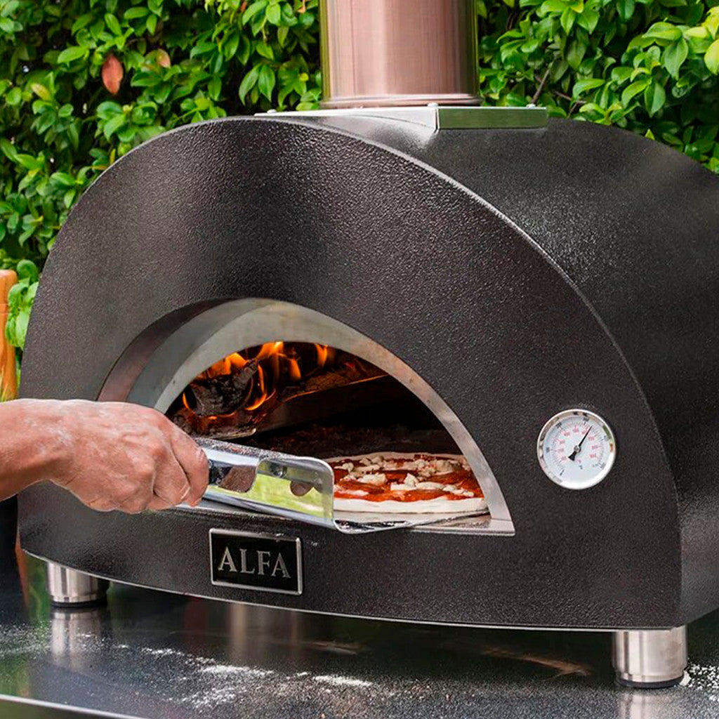 With its unmistakable Alfa design, the 1 Pizza oven from the Moderno line has a compact structure and weighs only 50 kg. It is ideal for those who want high cooking performance and the possibility to cook multiple dishes, while having little space available. Ready to use in just a few minutes, 1 Pizza by Alfa reaches temperatures up to 500°C and manages to make an authentic Neapolitan pizza in just 90 seconds. Like all Alfa ovens, the 1 Pizza model is also equipped with the innovative Heat Genius™ technology that guarantees superior performance and reduced consumption.
