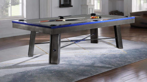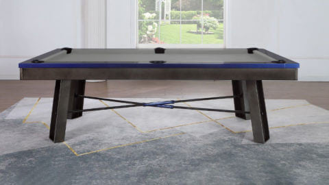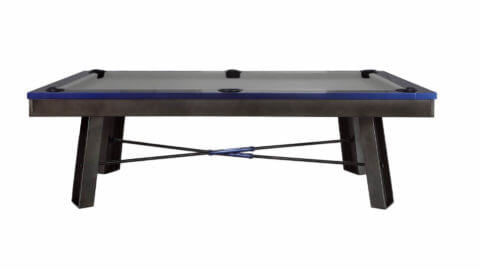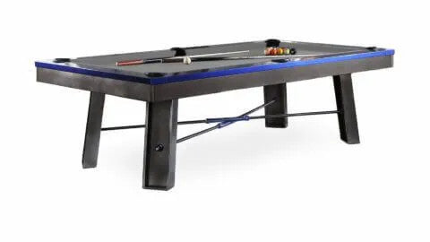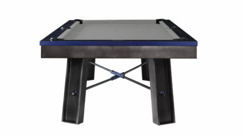 Plank and Hide Metal pool table for sale, the “Maddox”, is constructed from solid Steel with a Gunmetal Grey finish, and Electric Blue rails. This pool table for sale by Plank and Hide, the “Maddox” features metal angled legs, internal drop pockets, and has an Industrial Modern pool table styling, plus all Plank and Hide pool tables include 20 different pool table felt options, and can be purchased as an 8ft pool table size, known as a “standard pool table size”. Metal Pool Table Featuring Steel Rails, Frame, and Legs. Steel Angled Legs. Internal Drop Pockets Includes Standard Accessory Kit 8 Foot Plank and Hide Pool.